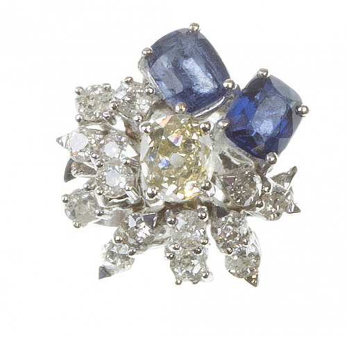 Sortija años 60 con brillantes engastados a diferentes altura y dos zafiros de talla oval