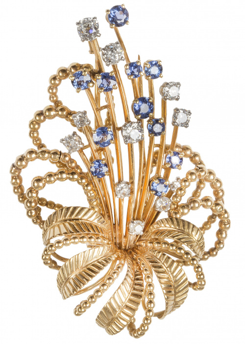 Broche retro años 50 con diseño de flor de brillantes y zafiros