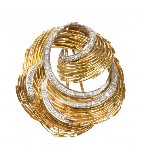 595. Broche años 50 con diseño a modo de nido realizado con hilos de oro y bandas de brillantes