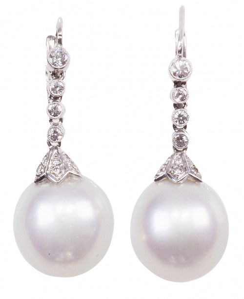 Las perlas encabezadas por cabuchón con brillantes. Peso total aprox btes: 0,42 ct. Diámetro perlas: 14 mm. Longitud: 3,4 cm.