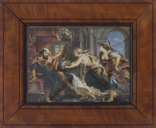 Miniatura sobre marfil adherida a vitela. 11 x 16 cm. En el reverso de la vitela inscrito a tinta (ilegible). La miniatura que presentamos está basada en el cuadro del “Banquete de Tereo” pintado por Rubens h. 1636- 1638 que se conserva en Museo Nacional del Prado. Obra que recoge el episodio tomado de las Metamorfosis en el libro VI (412- 674) y narra el brutal final de la historia de Tereo. Este estaba casado con Procné, con quien tenía un hijo, y que se enamora de su cuñada Filomena, a la que violó, aprisionó e hizo pasar por muerta, cortándole la lengua para asegurarse que no hablara. Filomena pudo contar su desgracia a su hermana y ambas planean su venganza. Procné mata a su hijo Itis y hace un guiso con su cuerpo que sirvió a Tereo, comiéndoselo sin sospechar nada. Al finalizar el tétrico banquete, Filomena entra en la estancia con la cabeza del pequeño en sus manos mientras que Procné le revela a Tereo lo que había pasado con su hijo. Se trata de una representación cargada de teatralidad y cuidada factura de un miniaturista anónimo aventajado. La escena se desarrolla en el interior del palacio de Tereo. En primer plano aparecen los protagonistas cuyos rostros manifiestan la tensión y el dramatismo del momento y al fondo un sirviente fisgando el suceso.
