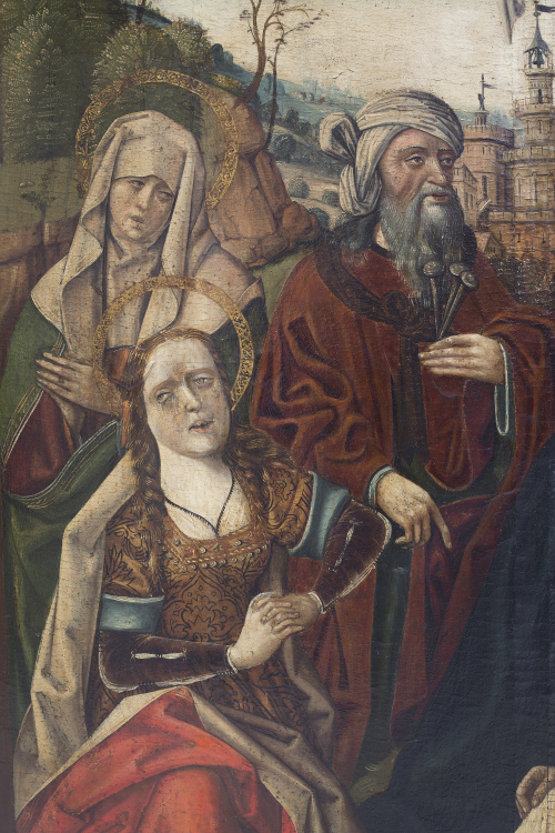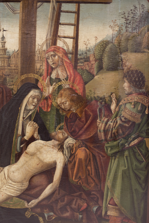 Óleo sobre tabla. 159 x 129 cm. Esta importante tabla inédita, de indudable depurado estilo, nos sitúa en Castilla cuando florecía el estilo hispanoflamenco, a finales del siglo XV o comienzos del XVI, y nos acerca al importante pintor Fernando Gallego (1468-1570). A través de un arco adintelado, resuelto severamente con un paramento de ladrillo que crea una profundidad evidente, el pintor representa en un paisaje la lamentación de la Virgen con el cuerpo de Cristo en su regazo, acompañada por las tres Marías, san Juan, Nicodemo y José de Arimatea. Con dibujo firme, el autor define no sólo los contornos de las figuras sino sus variados gestos dramáticos, forzados e inestables, de intensa mirada, que no mitigan en absoluto el horror del momento, recurso muy habitual en la producción de Gallego. Cabe destacar la peculiar grafía con que el pintor resuelve las barbas de Nicodemo y la forma de plegar las telas, casi artificial; ambas notas ayudan, junto a los gestos y actitudes de los personajes, al desarrollo de la acción. Las telas que caen sobre el suelo, quedando como amontonadas en un primer plano, recuerdan a Campin o a van der Weyden. Al fondo, un paisaje, Jerusalén, con motivos arquitectónicos que no olvida el más mínimo detalle con una gran peculiaridad en el modo de resolver las vegetaciones, con arbustos esbozados de manera sencilla. A comparar con el Tríptico de Santa Catalina de Francisco Gallego conservado en el Museo Catedralicio de Salamanca, especialmente en el modelo de María, tanto en la disposición como en la manera de resolver el nimbo (Ver: Pilar Silva Maroto: Fernando Gallego, Salamanca, Caja Duero. 2004, pág. 431).