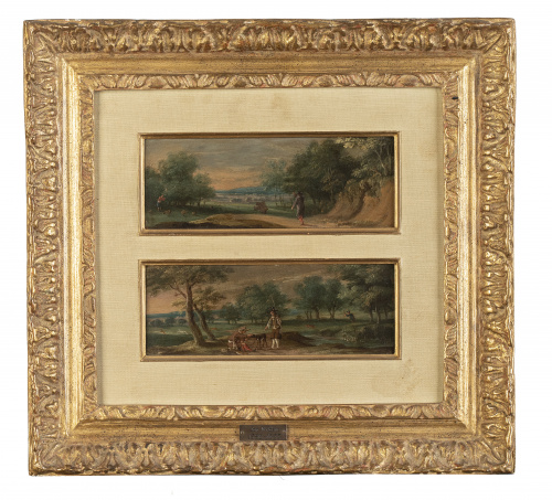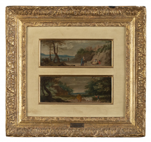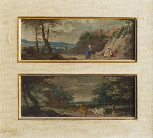“Dos pastores con su rebaño sobre un paisaje”, “Descanso de dos cazadores sobre un paisaje”, “Alto en el camino sobre un paisaje con pueblo al fondo” y “Pastor con dos vacas sobre un paisaje con cabaña al fondo”.