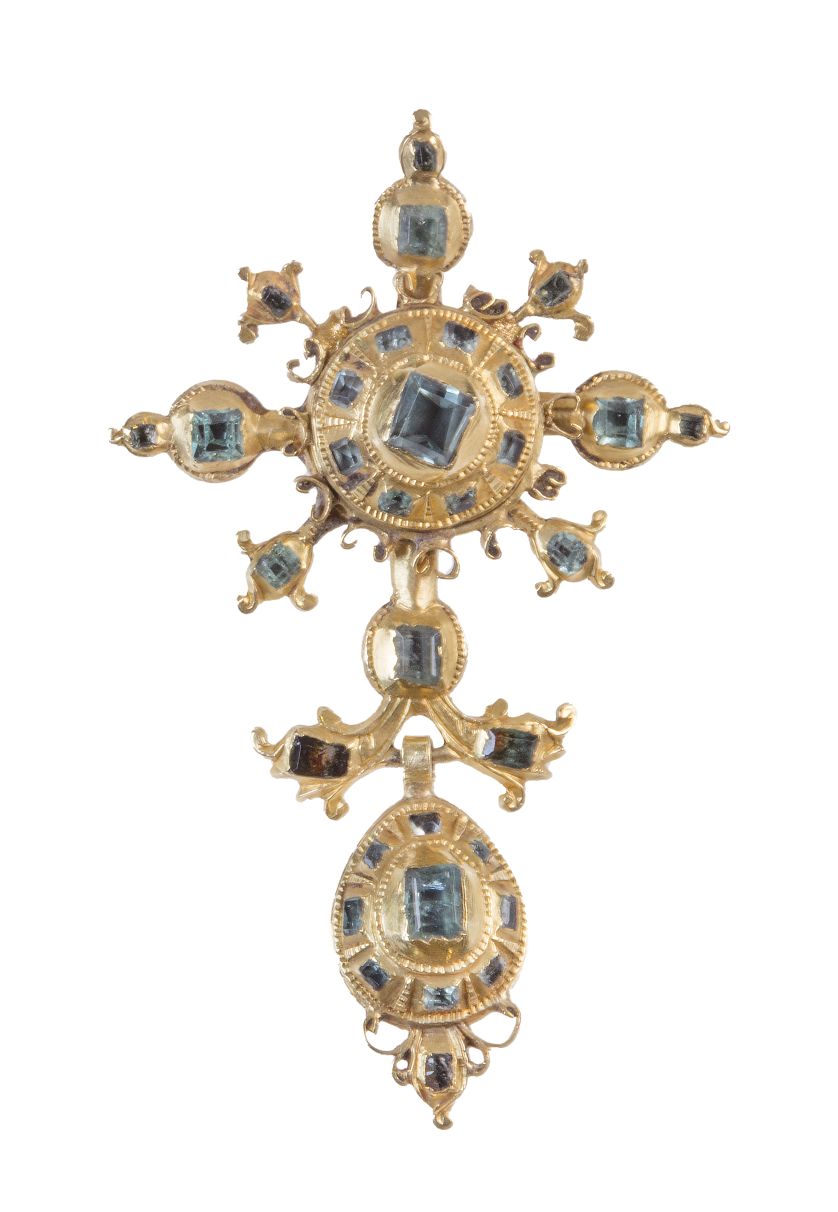 1. Cruz colgante popular de esmeraldas S. XVIII-XIX con perilla y trébol colgantes