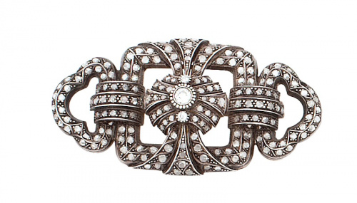 16. Broche placa de diamantes de pp. S. XX con diseño geométrico de bandas arqueadas combinadas, y con un brillante central