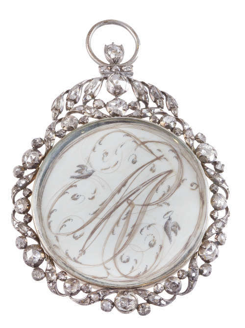 Colgante guardapelo S. XVIII de diamantes de talla rosa, con iniciales realizadas con pelo y aplicadas sobre miniatura de palomas y estilizadas formas vegetales
