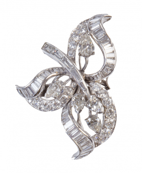 306. Original sortija en forma de gran flor años cincuenta, con brillantes y baguettes que forman tres pétalos rodeando diamantes talla perilla