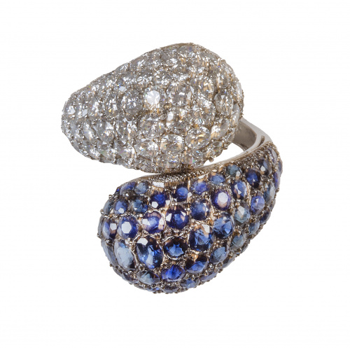 323. Sortija tú y yo con frente de dos brazos convexos completamente cuajados de pavé de zafiros y brillantes