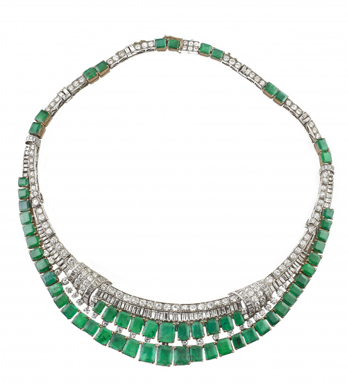 337. Collar de esmeraldas y brillantes años 40, con sesenta esmeraldas en dos líneas centrales principales, combinadas en la parte superior con dos líneas de rivière de diamantes talla baguette y brillantes