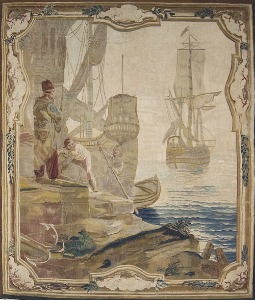 580. Tapiz en lana con escena de puerto, cenefa decorado con hojas de coral