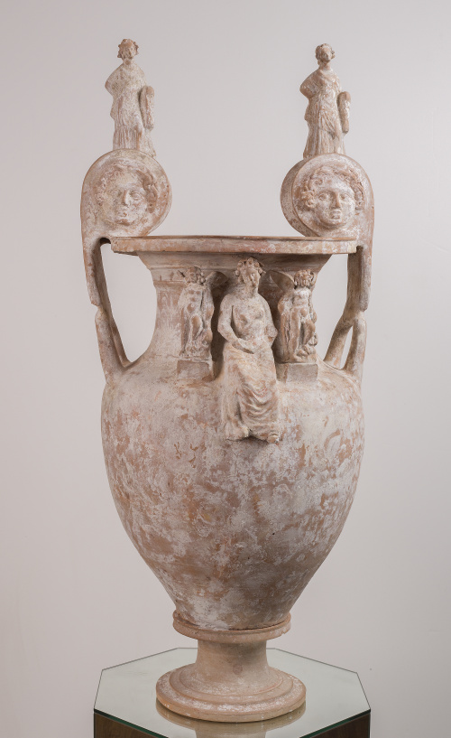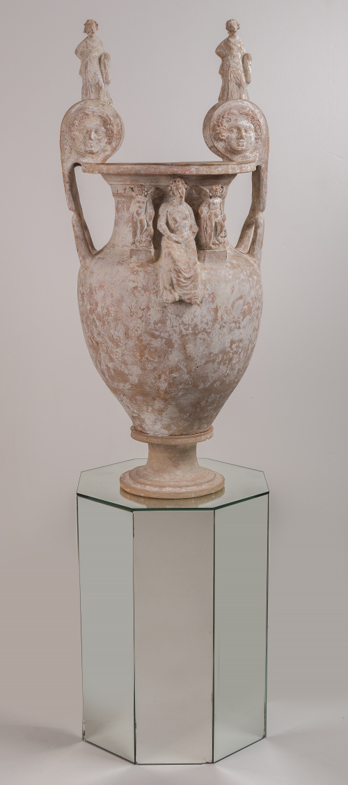 Gran ánfora pseudo ática en barro cocido recubierto de engobe con figuras en relieve, inspirada en modelos de cerámica de la Magna Grecia, S. XIX