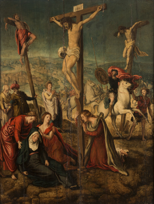 Con una técnica cuidada de suaves pinceladas y una composición organizada de fuerte dinamismo, el Maestro desarrolla la dramática escena de la Crucifixión, inmortalizando el momento de la Quinta Angustia de María que San Juan refiere en estas palabras “Junto a la Cruz de Jesús, permanecía de pie su Madre” (Jn 19, 25). En un entorno urbano, la Jerusalén celeste, el pintor dispone en un primer plano la figura de Cristo crucificado con una acusada diagonal. A la izquierda el grupo de la Virgen y San Juan mientras que la Magdalena llora a los pies de Cristo. A la derecha un grupo de soldados romanos, uno en un caballo en corveta y una lanza en la mano, y un grupo de hebreos característicamente vestidos se alejan después de haber presenciado el suceso. Los dos ladrones dispuestos en diagonal oblicua a la figura de Cristo cierran la composición.