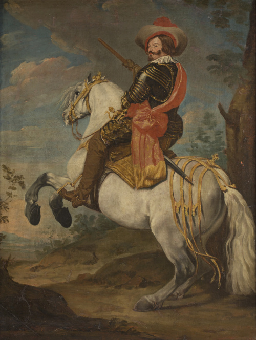 La obra que presentamos hasta ahora conservada en una importante colección privada española es, sin duda, una emulación a los retratos ecuestres reales pintados por Velázquez para el salón de Reinos del palacio de Buen Retiro. Sobre un fondo de paisaje esbozado, el pintor, dispone el retrato del Conde Duque de Olivares (ministro de Felipe IV en 1621 y 1643) sobre un soberbio caballo blanco en corbeta, visto de espaldas con el rostro vuelto al espectador en un habilísimo juego barroco de diagonales que acentúan al máximo el dinamismo de la composición. Con una pincelada resuelta y vibrante se representa al Conde Duque de manera regia portando una armadura y bengala de general con una rica y colorista banda roja emulando la victoria sobre los franceses en la ciudad fronteriza de Fuenterrabía en 1638.