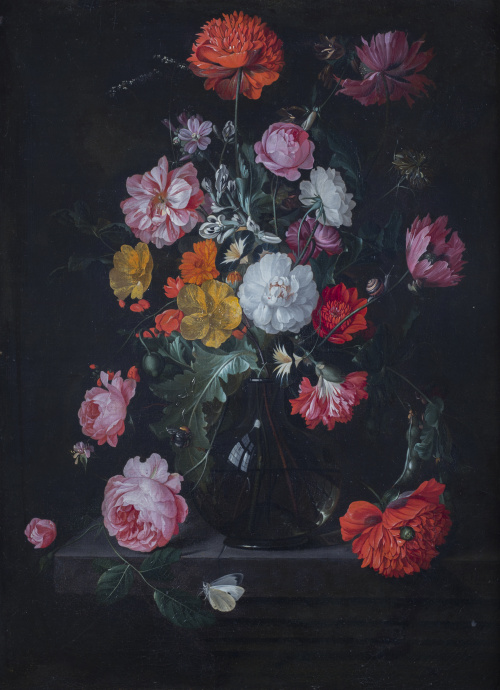 Nuestra obra es un ejemplo del estilo personal totalmente desarrollado de Cornelis, combinando el meticuloso manejo de la pintura y la atención al detalle heredada de su padre con la inventiva compositiva y la paleta brillante que dan a las obras de Cornelis su vitalidad única y riqueza visual. Nuestro lienzo demuestra la capacidad del artista para animar sus composiciones con colores vivos al mismo tiempo el efecto naturalista de los varios componentes, la mariposa, el caracol y la abeja. Otro elemento que nos llama la atención es el jarrón de cristal que, sobre una mesa de piedra, además de tener su función como jarrón, está pintado de tal manera que nos muestra parte de la habitación dotando a la composición de luz y profundidad.
