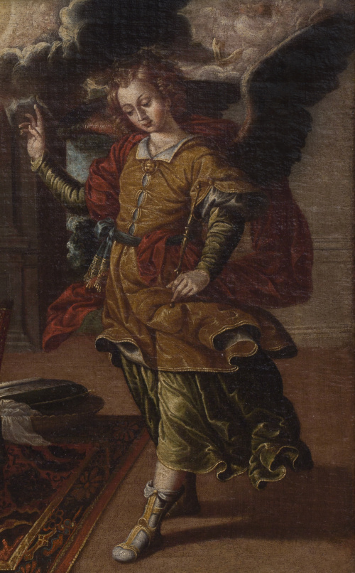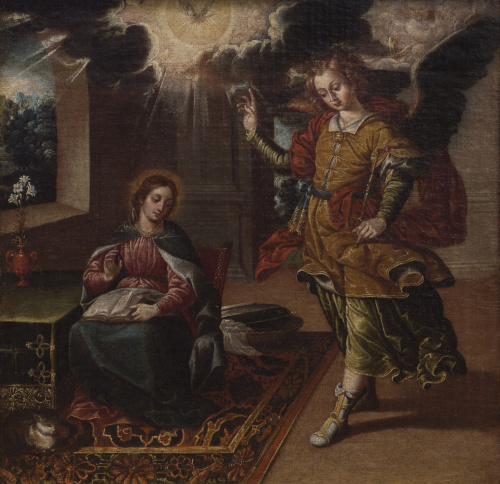Son pocas las obras conservadas del primer tercio del siglo XVII incluidas en el mercado y es sin duda una obra buena calidad y claramente representativa de este periodo. En una atmósfera íntima con una pincelada tersa, limpia y precisa se disponte la figura de la Virgen y el arcángel con Dios Padre cerrando la composición. Al fondo de abre una ventana llevando la mirada del espectador a un paisaje finamente ejecutado. Destacamos el jarrón de flores, elemento del que prescinde el pintor Baltasar Echave en su composición de la Basílica de Guadalupe. Por último, es sin duda excelente, la figura del San Gabriel arcángel cuyas estolas sobrevuelan a su espalda recurso utilizado por pintores como Cristóbal Villalpando y Juan Correa, que cumple esa fijación de seres rubios, desmelenados y andróginos que tanto dominaron en la pintura colonial mexicana cuyo recurso fue introducido por el flamenco Martín de Vos.