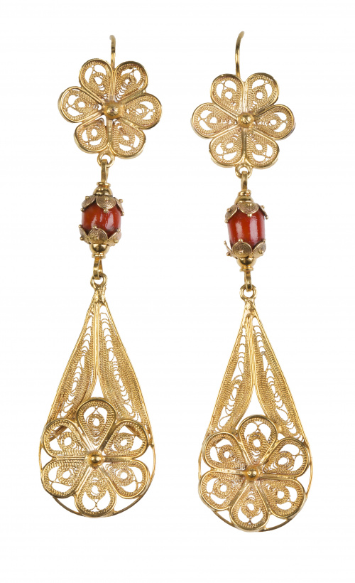 Pendientes largos de pp. S. XX en filigrana de plata vermeill adornados con cuenta de coral