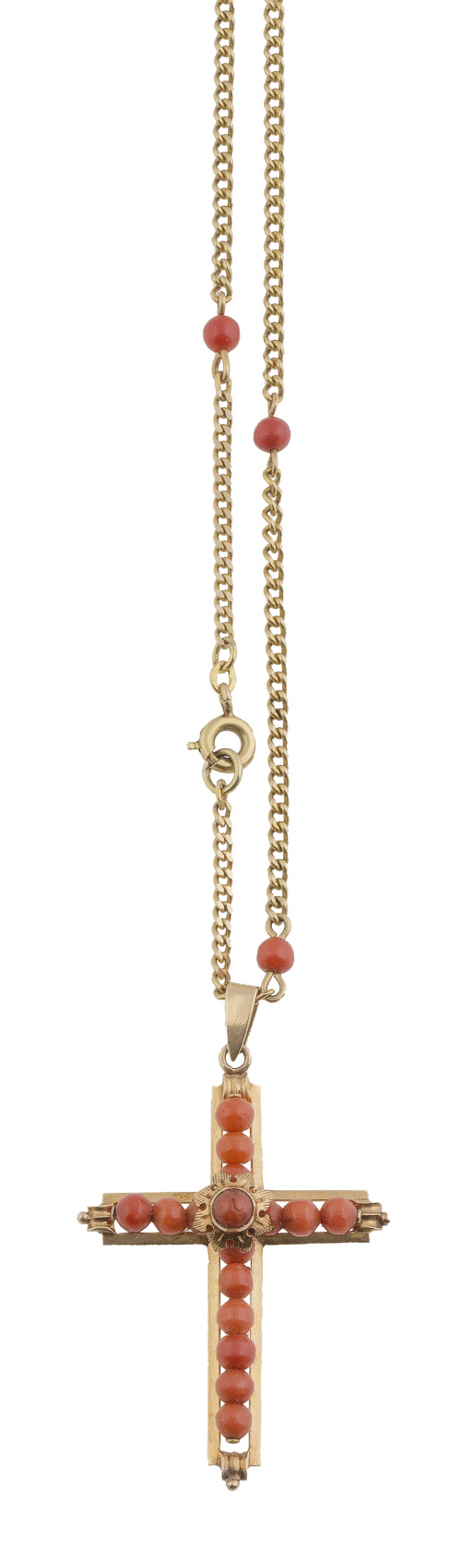 32. Colgante de cruz de esferas de coral en marco de oro, con cadena de eslabón barbado y esferas de coral alternas