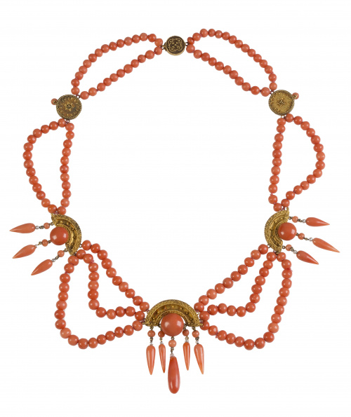 La gargantillla presenta hilos de cuentas de coral dobles o triples unidos en cinco puntos piezas de oro con filigrana y adornos de perillas de coral colgante en los tres centrales.