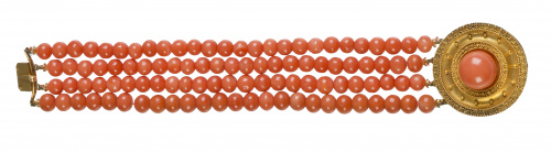 El brazalete con tres hilos de coral y centro circular de oro y fligrana aplicada con gran botón de coral central.