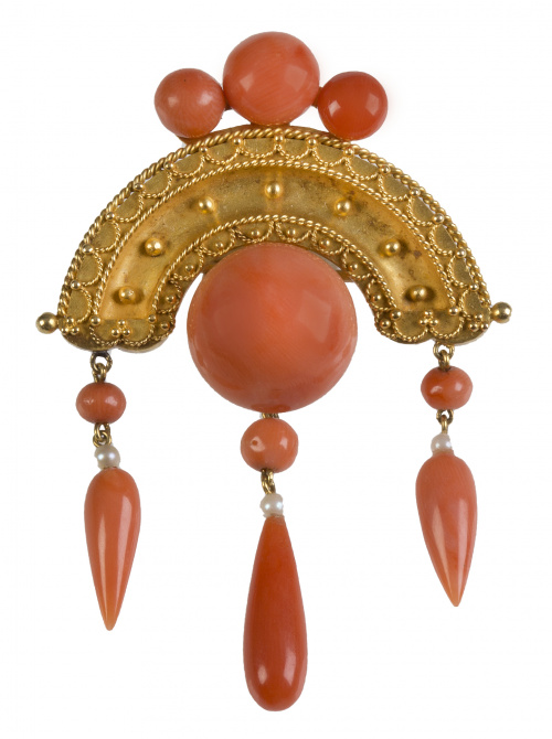 41. Conjunto de gargantilla, brazalete y broche S. XIX de coral y oro con decoraciones de filigrana aplicada y punzones franceses