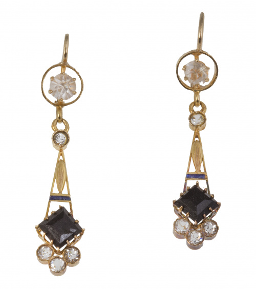 47. Pendientes largos con circonitas y símil zafiros con diseño geométrico