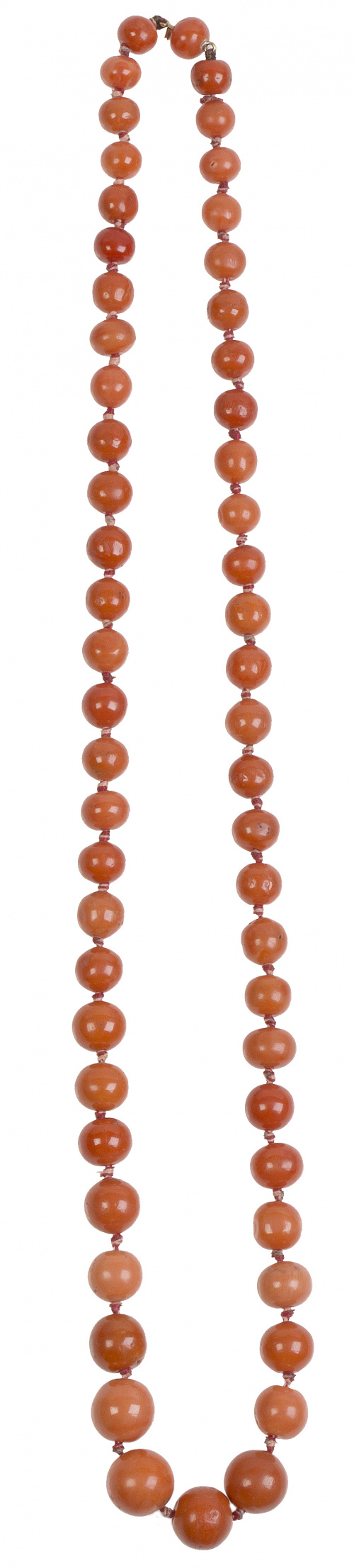 Collar largo de pp. S. XX de cuentas esféricas de coral mediterráneo