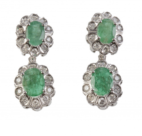 101. Pendientes con dos rosetones con centro de esmeralda orlado de brillantes, desmontable