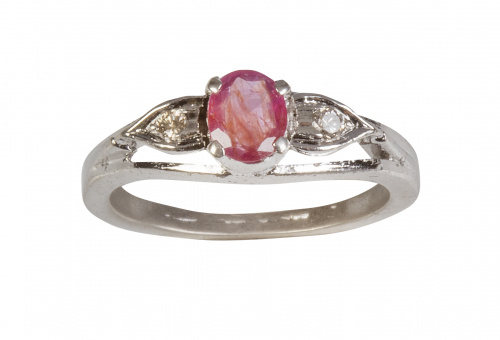 109. Sortija con rubí central de talla oval flanqueado por dos hojitas con brillantes