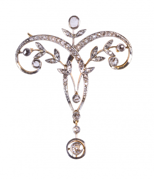 21. Broche de diamantes Belle Epoque con diseño simétrico de ramas entre cintas, y brillante en chatón colgante.