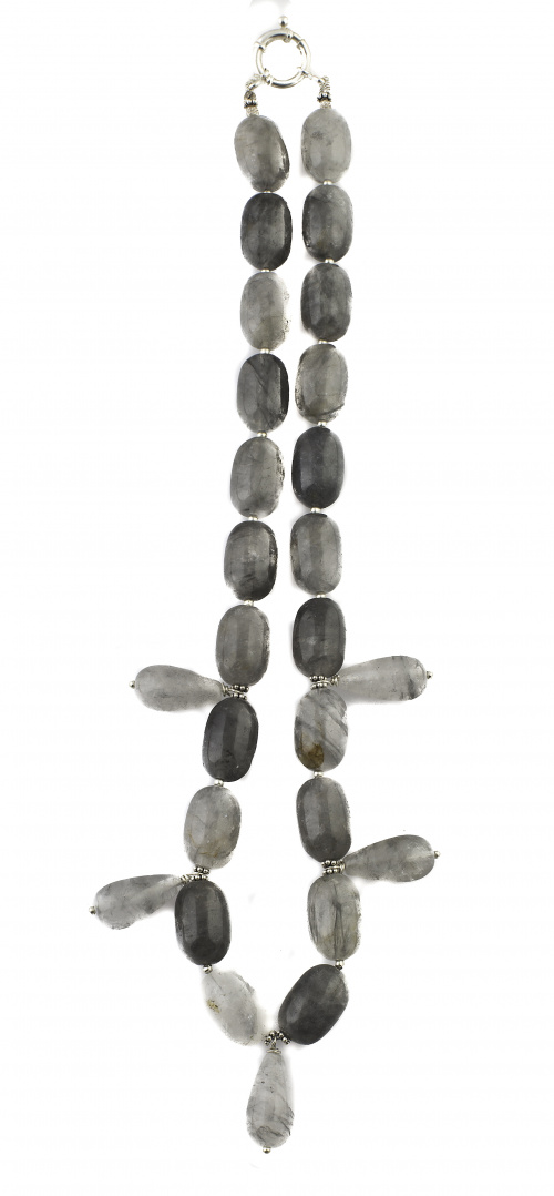 275. Conjunto de collar con piedras ovales alternos con lágrimas y pendientes en ágata grisácea en plata