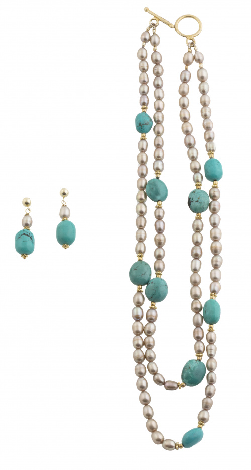 286. Conjunto de gargantilla doble y pendientes con perlas cultivadas de ligera tonalidad bronce, y turquesas de Arizona