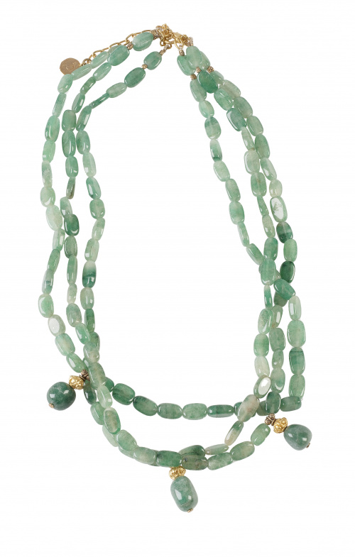 288. Collar de tres hilos de cuarzo aventurina verde con cierre y entrepiezas de plata dorada