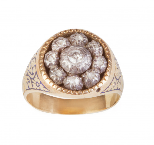 31. Sortija rosetón portuguesa S. XIX de diamantes, con montura grabada y decorada con esmalte negro en los laterales