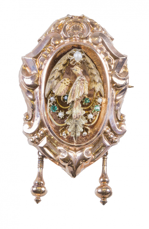 33. Conjunto de broche y pendientes en oro labrado con pajaritos aplicados