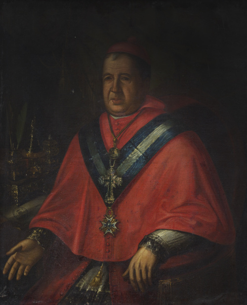 Retrato de un arzobispo caballero de la Orden de Carlos III sentado junto a una mesa con una escribanía y papel con sello cardenalicio estampado