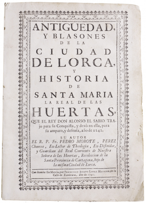 PEDRO MOROTE PÉREZ CHUECOS (1680 - 1763)“Antiguedad y blasones de la ciudad de Lorca, y Historia de Santa María de las Huertas, que el rey Don Alonso trajo para su conquista y dexó en ella para su amparo y defensa, año de 1242”.