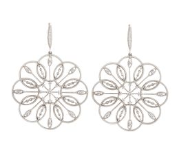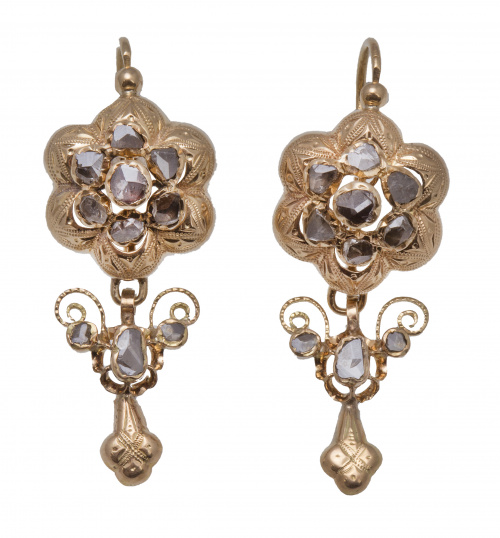 6. Pendientes largos isabelinos S.XIX con flor y motivo colgante adornados con diamantes talla rosa