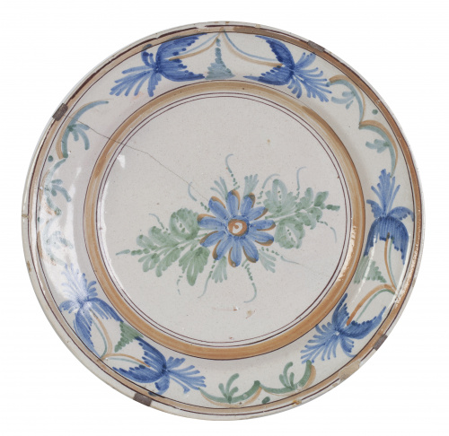 705. Plato de cerámica esmaltada en azul, verde y ocre.