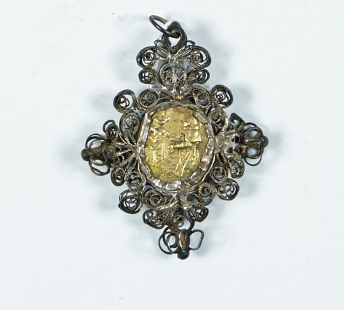 Medallón devocional en bronce dorado montado en filigrana de plata.Trabajo español, ffs. S. XVI..