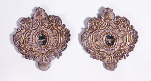 Pareja de relicarios en metal plateado, reliquias bajo vitrales con filacterias “Doña María Coronel y P. Tena”, S. XVIII