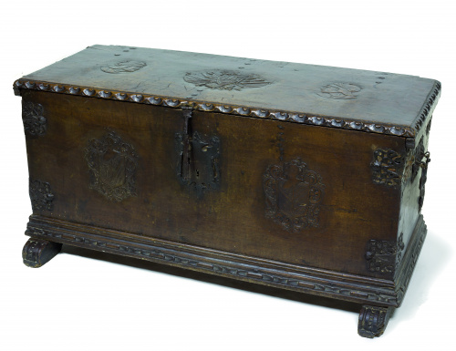 Arca en madera de nogal tallado, con bisagras y chapas recortadas de refuerzo en las esquinas en hierro forjado.