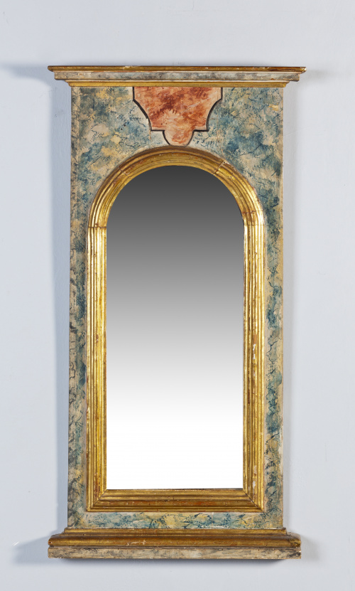 Espejo en madera tallada, marmorizada y dorada.