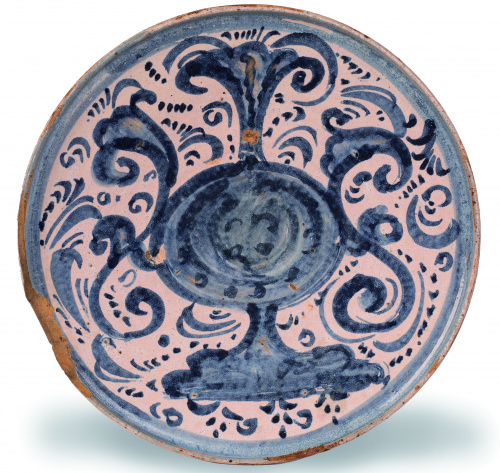 740. Salvilla de cerámica esmaltada en azul de cobalto, con un jarrón y hojas en el asiento.