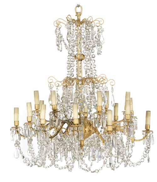 Lámpara de dieciocho luces, metal dorado y vidrio tallado, estilo imperio.