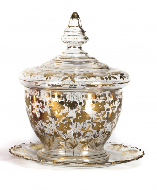 803. Compotera de cristal transparente y decoración de hojas doradas,