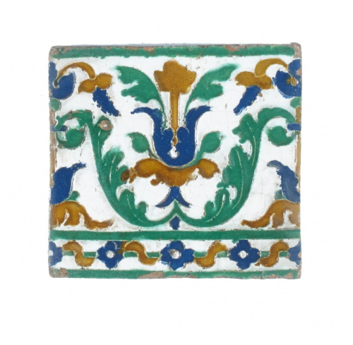 808. Azulejo de cerámica con la técnica de arista viva, esmaltada en melado, verde y azul, con decoración vegetal.