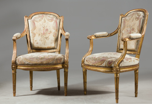 Pareja de butacas de estilo Luis XVI en madera tallada y dorada.