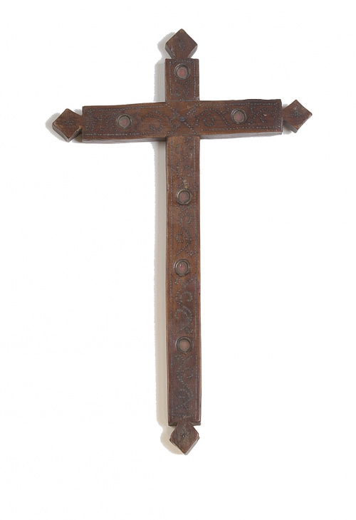 Home / SUBASTA DE JULIO / Cruz relicario de madera con incrustaciones en metal.Traba