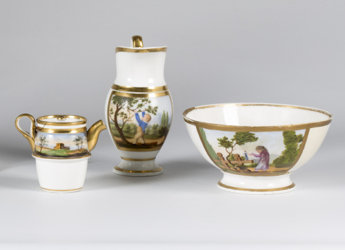 Jofaina, palangana, cafetera en porcelana esmaltada con escenas de niños y dorado.