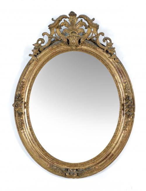 848. Espejo ovalado con copete de volutas en madera, estucada y dorada.